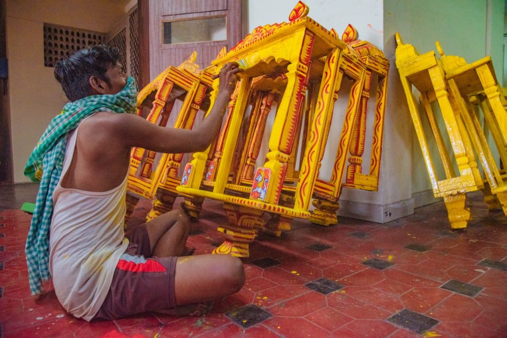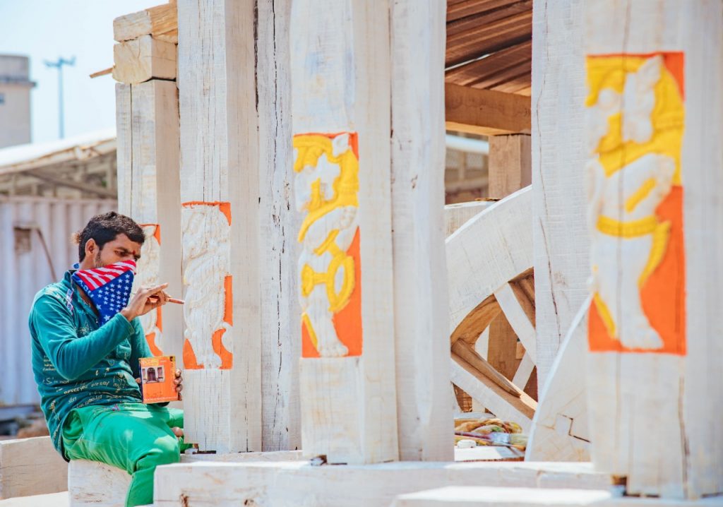 ସେହିପରି ରଥଖଳାରେ ସୋମବାର ତିନିରଥରେ ନାହାକା ବାନ୍ଧେଣି ନିମନ୍ତେ ତଳ କଇଁଚି ରଥର ଦକ୍ଷିଣ ପାଶ୍ୱର୍ରେ ଫିଟିଙ୍ଗ କରାଯାଇଥିଲା । ବାମପାର୍ଶ୍ୱରୁ କଇଁଚି ରଥକାମ ବନ୍ଦ ପୂର୍ବରୁ ଲଗାଯାଇଛି ।ମଙ୍ଗଳବାର ତିନି ରଥର ବଡଧରା ପୋଟଳ ଲଗାଯାଇଛି । ଏଥିସହିତ ତିନି ରଥର ମୂଳ ଭୂଇଁରେ କଇଁଚି ବାଡିଆ ସହ ଅଗ ଭୂଇଁରେ କଇଁଚି ବାଡିଆ କାମ ଚାଲିଛି । ମଙ୍ଗଳବାର ତିନି ରଥର ୪ଟି ଲେଖାଁଏ କତରା ଆଗଆଣି-୨ଟି ଏବଂ ପଛଆଣି ୨ଟି ତିଆରି ଚାଲିଛି । ଚାରପରିଛା ଉପରେ କତରା ବାଡିଆ ହୋଇ ଏଥିରେ ରଥର ଘୋଡା ବନ୍ଧାଯିବ । ଉକ୍ତ ଚାରପରିଛା ରଥରେ ବାଡିଆ ହୋଇଛି । ରୂପକାର ସେବକମାନେ ଚାରପରିଛା ଏବଂ ନାଟଗୋଜରେ ରାହୁଚାପ ଏବଂ ଚାନ୍ଦିଲତା ଖୋଦେଇ କରୁଛନ୍ତି । ଖୋଦେଇ କାମ ସରିଥିବା ନାଟ ଗୋଜ ଗୁଡିକୁ ରଙ୍ଗ କରାଯିବା ପାଇଁ ଚିତ୍ରକର ସେବକମାନଙ୍କ ପାଖକୁ ପଠାଇଛନ୍ତି । ଶ୍ରୀମନ୍ଦିର ନୂତନ କାର୍ଯ୍ୟାଳୟ ଠାରେ ପାର୍ଶ୍ୱ ଦେବାଦେବୀ ମାନଙ୍କର ରଙ୍ଗକାର୍ଯ୍ୟ ଚିତ୍ରକର ସେବକମାନେ କରୁଛନ୍ତି ।